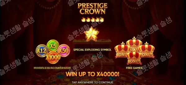고대 왕성의 잊혀진 보물창고 문이 열립니다. 엔돌피나(Endorphina)의 신작 프레스티지 크라운은 6x5 그리드의 스캐터 페이(Scatter Pays) 방식을 채택한 슬롯입니다. 연쇄 폭발 시스템과 화면 어디서든 당첨되는 기믹을 바탕으로, 단일 스핀에 최대 1,000배까지 떨어지는 배수 폭탄과 프리 스핀의 영구 누적 배수 시스템을 결합하여 최대 40,000배의 강력한 잭팟 포텐셜을 자랑합니다.