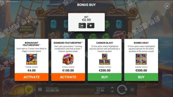 베이스 게임의 극심한 변동성을 피하고 싶다면, 베팅액 50배의 밤바드 퓨처스핀(대포 확정 스핀)으로 단기 타격을 노리거나, 자금이 충분할 때 250배 밤즈 어웨이(영구 하이라이트)를 구매하여 해적선의 가장 깊은 20,000배 보물 상자를 직접 겨냥해 보시길 강력히 권장합니다.