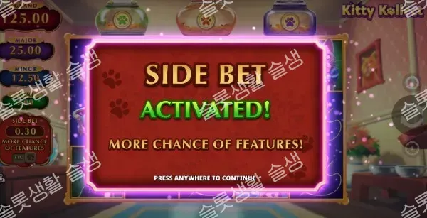 기본 RTP는 95.98%로 살짝 낮지만, 사이드 벳 기능을 켜면 환수율이 96.03%로 상승하여 보너스 당첨 확률과 전반적인 기대 수익을 전략적으로 끌어올릴 수 있습니다.