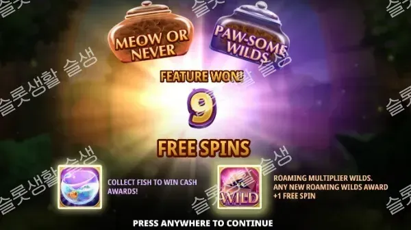 마찬가지로 9회의 무료 스핀이 제공되나 메커니즘이 다릅니다. '어항(Fish Bowl)' 수집 기능이 활성화되어, 스핀을 돌리는 동안 어항에 상금을 차곡차곡 모아 추가 보상을 획득합니다.