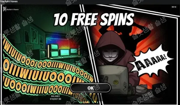 가면 스캐터의 개수(3, 4, 5개)에 따라 10회의 각기 다른 프리 스핀 레벨이 시작됩니다. (스핀 중 해커가 화면에 난입하여 무작위로 보너스를 던져주기도 합니다.)