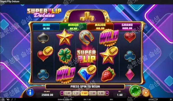 슈퍼 플립 디럭스는 에너지 넘치는 네온 컬러와 현대적인 그래픽을 통해 고전적인 과일 머신의 매력을 극대화했습니다. 다이내믹한 퍼플 및 블루 톤의 배경 위로 딸기, 클로버, 황금 별 등 친숙한 상징들이 화려하게 빛납니다. 깔끔한 인터페이스와 활기찬 사운드는 플레이어에게 직관적이고 경쾌한 게임 경험을 제공합니다.