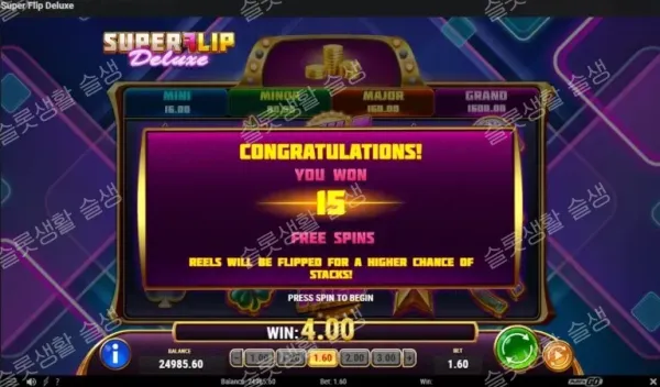 슈퍼 플립 디럭스는 시대를 초월한 클래식의 힘을 보여줍니다. 플레이앤고는 복잡한 시스템 대신 '뒤집힌 릴'과 '즉석 상금'이라는 명확한 타격 포인트에 집중했습니다.