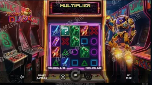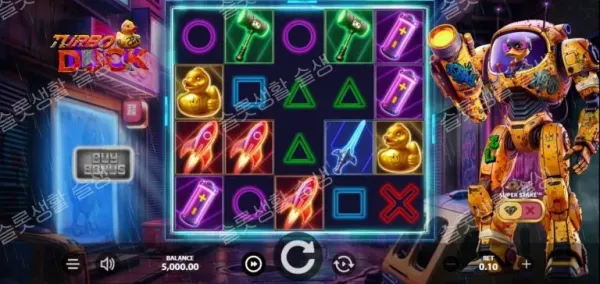 스테이크로직의 터보 덕은 단순한 슬롯을 넘어 한 편의 액션 애니메이션을 보는 듯한 타격감을 자랑합니다. 쿼크-9의 터보 블래스트가 릴을 강타할 때의 전율은 압권입니다.