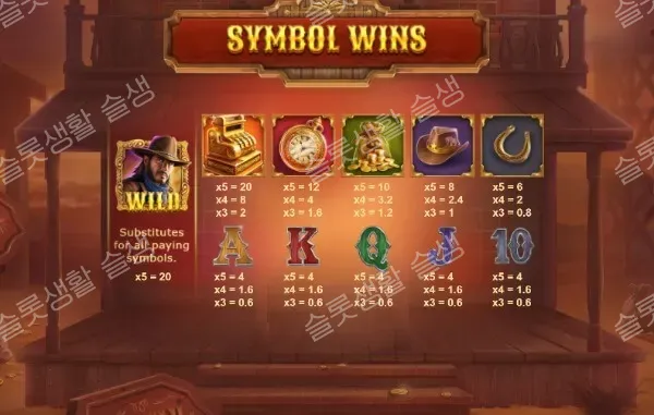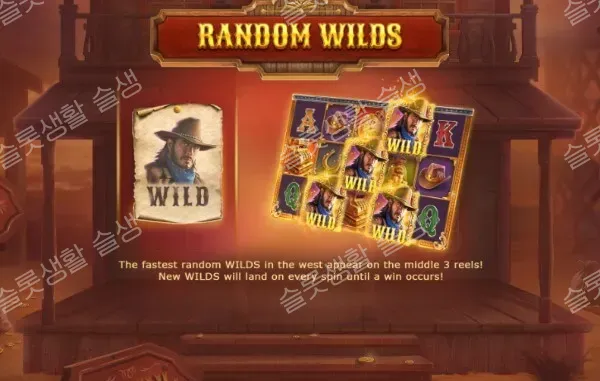 모래바람이 부는 서부의 마을, 텀블위드가 굴러다니는 황야를 배경으로 합니다. 릴은 나무 현상수배지 틀처럼 디자인되었으며, 총, 돈가방, 말발굽, 보안관 배지 등 상징적인 아이템들이 심볼로 등장합니다. 배경에 깔리는 서부 영화 스타일의 사운드트랙은 비장미 넘치는 분위기를 완성합니다.