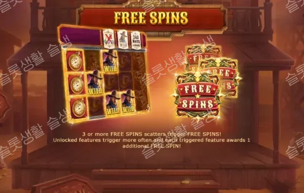 초반엔 심심하더라도 3가지 기능을 모두 해제한 후 무료 스핀에 진입한다면, 무법자처럼 쏟아지는 당첨금을 경험할 수 있을 것입니다."