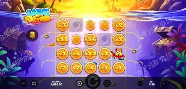 조스 오브 포춘은 자칫 뻔해질 수 있는 바다 낚시 테마에 '상어의 추격전'이라는 역동적인 스토리를 입혀 차별화를 이뤄냈습니다. 특히 베이스 게임에서도 상어 2~3마리가 겹쳐 지나갈 때 만들어지는 고배수 와일드는 보너스 라운드 못지않은 짜릿함을 선사합니다.
