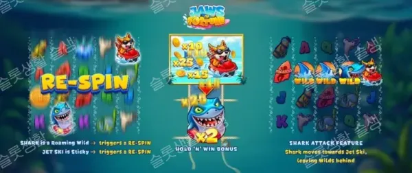베이스 게임에서 가장 중요한 수익 창출 메커니즘은 '상어(2, 3, 4번 릴)'와 '제트스키(5번 릴)'의 만남입니다. 둘 중 하나가 먼저 랜딩되면 그 자리에 고정된 채로 리스핀이 주어집니다.