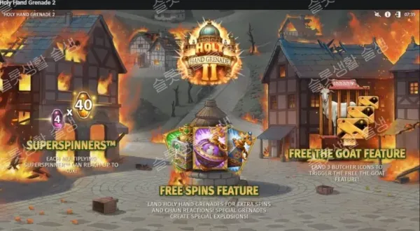 프린트 스튜디오(Print Studios)가 선보이는 홀리 핸드 그레네이드 2는 영화 *'몬티 파이튼의 성배'*의 블랙 코미디를 계승한 중세 종교 테마의 슬롯입니다. 릴 사이에 위치한 배수 장치인 '수퍼스피너(SuperSpinners™)'와 주변 심볼을 폭파 및 변환시키는 수류탄 기믹을 통해 최대 30,000배의 당첨을 노릴 수 있으며, 릴랙스 게이밍의 '드림 드롭(Dream Drop)' 프로그레시브 잭팟 네트워크와도 연동됩니다.