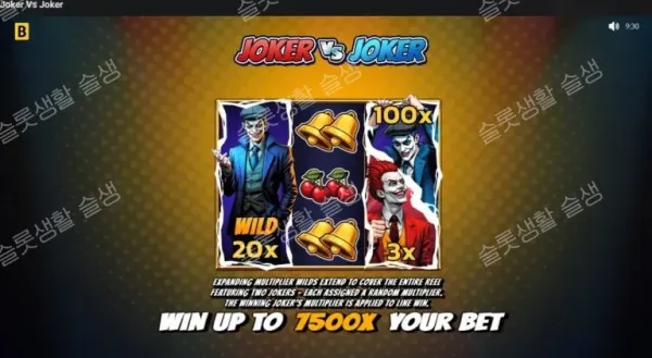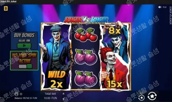 비게이밍(BGaming)이 출시한 조커 대 조커(Joker vs Joker)는 3x3 그리드와 5개의 페이라인을 가진 클래식 과일 슬롯에 현대적인 대결(VS) 메커니즘을 결합한 게임입니다. 두 조커의 대결을 통해 최대 100배의 확장 와일드 멀티플라이어를 획득할 수 있으며, 중간(Medium) 변동성 게임임에도 최대 7,500배의 준수한 당첨금을 제공합니다.