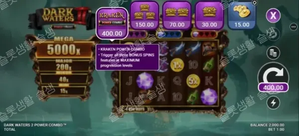 | 다이아몬드 피처 (보너스 구매) | 15x ~ 400x | 15배(코인 버스트)부터 400배(가장 강력한 크라켄 파워 콤보 결합)까지 다양한 조합의 프리 스핀을 즉시 구매할 수 있습니다. |