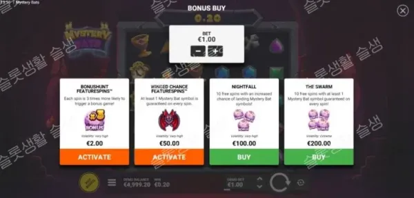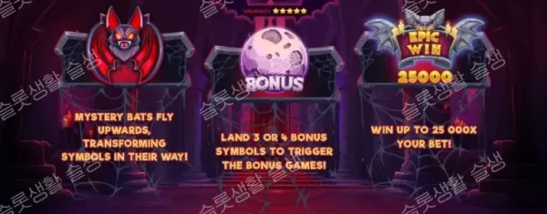 | The Swarm (슈퍼 보너스) | 200x (또는 4 스캐터) | 10회의 프리 스핀. 매 스핀마다 최소 1마리 이상의 미스터리 박쥐가 무조건 보장됩니다. (96.35%) |