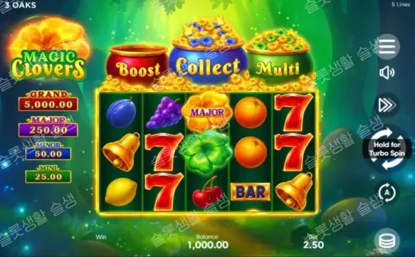 매직 클로버는 최근 유행하는 '세 가지 수집통(더하기, 곱하기, 수집하기)' 기믹을 5라인 클래식 슬롯에 이식한 무난한 홀드 앤 윈(Hold & Win) 게임입니다. 보너스 라운드의 시각적 연출과 콤보가 터질 때의 쾌감은 훌륭합니다.