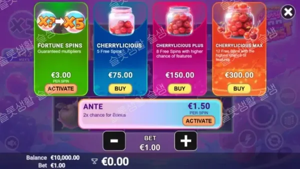 | Cherrylicious | 75x | 기본 프리 스핀 진입 (가장 낮은 초기 릴 세팅) |