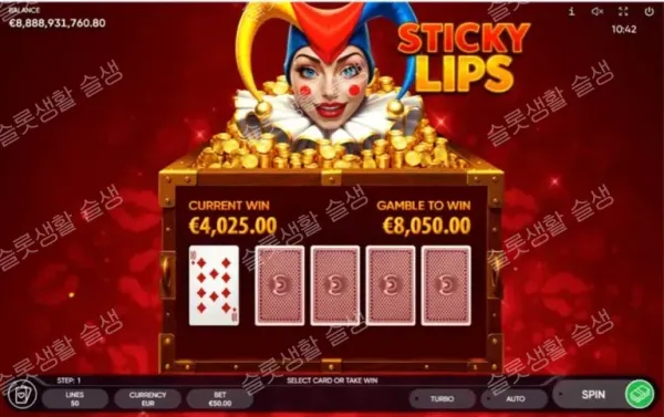 스티키 립스는 2,200배의 낮은 한계치와 중간(Medium) 변동성을 지닌 방어형 게임입니다. 따라서 보너스 한 방을 노리기보다는 엔돌피나 슬롯의 핵심인 '리스크 게임(Gamble)'을 똑똑하게 활용해야 합니다. 딜러의 카드가 2~5로 매우 낮을 때만 리스크 게임을 시도하고, 10, J, Q, K, A와 같이 딜러 카드가 높을 경우에는 도전을 포기하고 즉시 상금을 수령(Take Win)하여 시드머니를 차곡차곡 쌓는 전략이 핵심입니다.