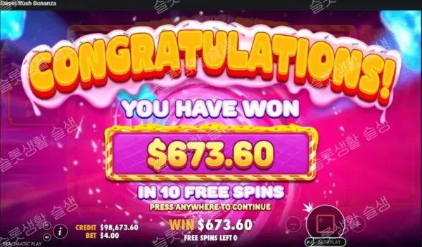 베이스 게임에서 4개 이상의 롤리팝(스캐터)이 랜딩되면 10회의 프리 스핀이 시작됩니다. (프리 스핀 중 3개 이상의 스캐터 랜딩 시 +10회 추가)