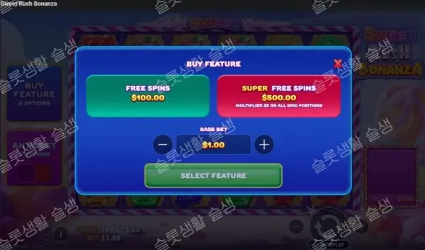 | 러시 프리 스핀 구매 (Rush Free Spins) | 500x | 프리 스핀 시작 시 그리드의 모든 칸(30칸)이 기본 2배(x2) 멀티플라이어가 적용된 상태로 시작하는 최상위 보너스입니다. |