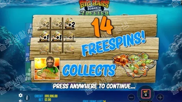 스캐터 3개로 10회의 무료 스핀을 얻습니다. 낚시꾼(Wild)이 나올 때마다 물고기 금액을 수집하고, 낚시꾼을 4명 모을 때마다 스핀이 10회씩 연장되며 멀티플라이어가 2배 -> 3배 -> 10배로 증가합니다.