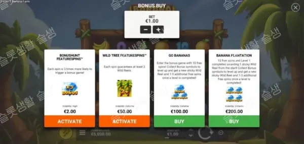 | Banana Plantation (2단계 구매) | 200x | 와일드 릴 1개를 확정 고정하고 시작하는 상위 보너스에 즉시 진입합니다. |