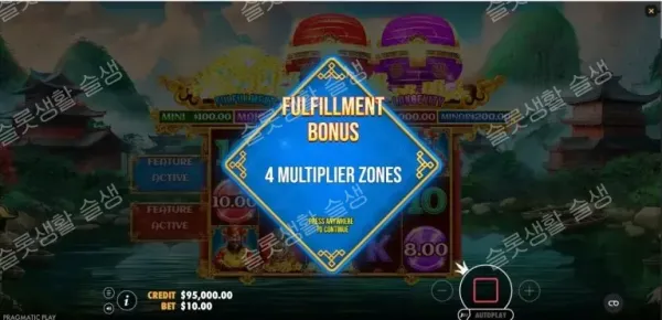 - 파란색 코인 (Fulfilment): 그리드를 4개의 구역으로 나누고 각각 무작위 배수(2x~10x)를 할당합니다. 한 구역이 머니 심볼로 꽉 차면 해당 구역의 모든 코인에 배수가 곱해집니다.