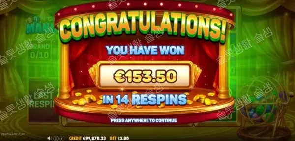 베이스 게임이나 프리 스핀 중 6개 이상의 빙고 심볼이 랜딩되면, 해당 심볼들이 코인(0.25x ~ 1000x 가치)으로 변환되며 메인 이벤트인 '빙고 보너스'가 시작됩니다.
