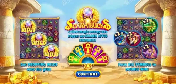 동일한 심볼 4개가 2x2 정사각형 형태로 뭉치면 2배(2x) 멀티플라이어를 가진 '디바인 블레싱' 빅 심볼로 합쳐집니다. 또한 매 스핀 무작위로 하위 심볼에 마킹이 생기며, 해당 심볼이 당첨되면 2개의 와일드를 남기는 '와일드 스캐럽' 기능이 베이스 게임의 타격감을 높여줍니다.