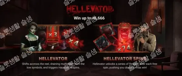 베이스 게임 중 무작위로 중앙 3번 릴 전체를 덮는 거대한 멀티플라이어 와일드(Hellevator)가 등장할 수 있습니다. 이 와일드는 단순히 기호를 대체하는 것에 그치지 않고 리스핀을 유발합니다. 리스핀 동안 엘리베이터가 그리드에 있는 모든 하위(Low) 심볼의 값을 게걸스럽게 흡수하여 자신의 단일 멀티플라이어 배수를 기하급수적으로 부풀려 거대한 당첨을 만들어냅니다.