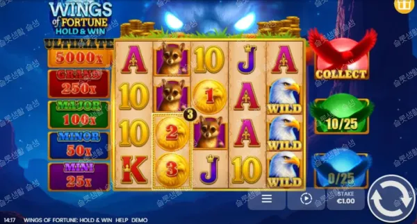 보너스가 시작되면 그리드가 6x6(총 36칸)으로 거대하게 확장되며 3번의 리스핀이 주어집니다. 매 스핀마다 최대 5개의 동전과 6마리의 특수 독수리가 동시에 떨어질 수 있어 폭발적인 상금 펌핑과 수집이 연쇄적으로 일어납니다. 또한 라운드 종료 시, 그리드에 채워진 동전의 '개수'에 따라 고정 잭팟이 추가로 지급됩니다.