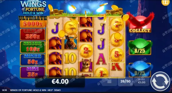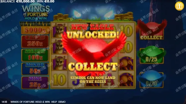 동전 클러스터의 상금은 주변에 '독수리 심볼'이 안착했을 때만 획득할 수 있습니다. 처음에는 수집만 하는 '콜렉트 이글(Collect)'만 등장하지만, 그리드에 독수리가 떨어질 때마다 우측 게이지가 1칸씩 차오르며 더욱 강력한 독수리들을 해금(Unlock)합니다.