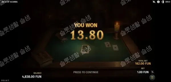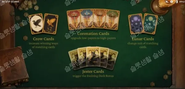 보너스 라운드의 핵심은 모든 변형 카드(업그레이드, 문양 통일, 까마귀 복제 배수)의 효과가 스핀이 넘어가도 초기화되지 않고 '영구적으로 누적(Permanent)'된다는 점입니다. 스핀을 거듭할수록 내 카드 덱의 파워가 기하급수적으로 강력해지는 로그라이크(Roguelike) 덱 빌딩 게임의 묘미를 슬롯에 완벽하게 이식했습니다. 보너스 중 제스터 카드가 나올 때마다 프리 스핀이 1회씩 추가됩니다.