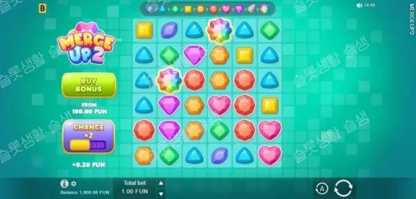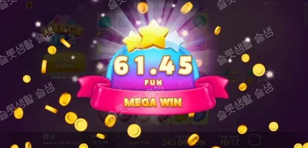 수직이나 수평으로 동일한 심볼 4개 이상이 뭉치면 당첨됩니다. 일반 슬롯처럼 심볼이 단순히 사라지는 것에 그치지 않고, 당첨된 기호 일부가 결합하여 다음 레벨(최대 9레벨)의 상위 보석으로 진화(Merge)하여 자리에 남습니다. 이를 통해 연쇄 소거 과정에서 자연스럽게 고배당 심볼 군집이 형성됩니다.