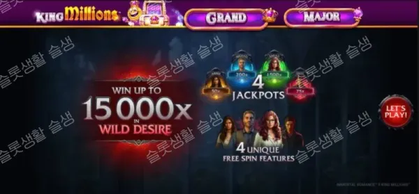 마이크로게이밍(현 Games Global) 산하의 스톰크래프트 스튜디오(Stormcraft Studios)가 전설적인 뱀파이어 테마 슬롯의 정식 후속작인 이모탈 로맨스 2 킹 밀리언즈를 출시했습니다. 전작의 243 웨이즈(Ways) 구조에 연쇄 소거(Rolling Reels™) 시스템을 더했으며, 핵심인 '와일드 디자이어(Wild Desire™)' 기능이 발동하면 1,024 웨이즈로 그리드가 확장되며 압도적인 퍼포먼스를 보여줍니다. 4명의 캐릭터 잭팟과 메가 잭팟 네트워크인 '킹 밀리언즈'가 결합되어 최대 15,000배(킹 밀리언즈 잭팟 제외)의 당첨금을 제공하는 초고변동성 게임입니다.