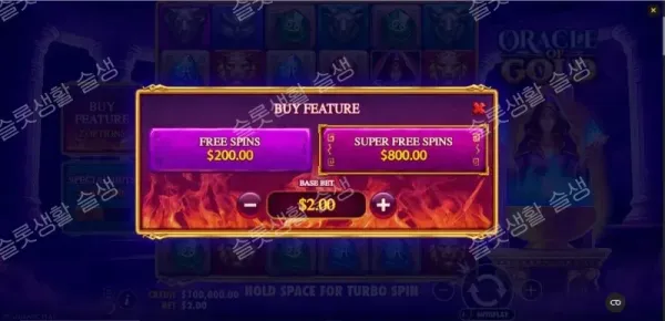| Super Spin (슈퍼 스핀) | 기본 200x | 와일드 배수가 3x 또는 10x로 대폭 상향된 스핀 1회를 진행합니다. (※ 해당 모드에서는 프리 스핀 트리거 불가) |