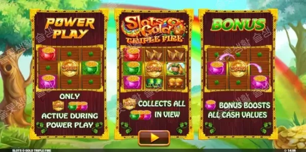 | Power Play | 기본 베팅의 5배 지불 | 활성화 시 릴 위의 일반 페이 심볼이 모두 사라지고 오직 현금 기호와 수집 기호만 등장합니다. 보너스 진입 확률이 극대화되며, 보너스 발동 시 무조건 1개 이상의 트리플 파이어 팟 업그레이드가 확정적으로 보장됩니다. |