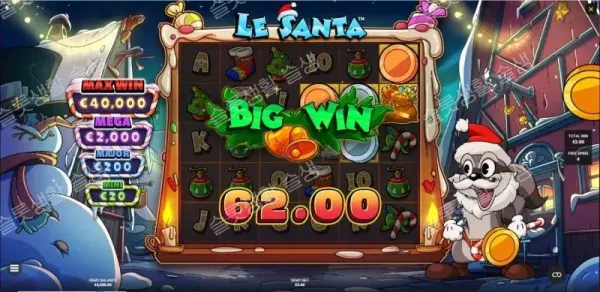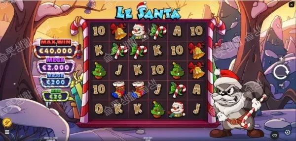 핵소 게이밍(Hacksaw Gaming)의 상징적인 너구리 캐릭터 '스모키'가 산타 복장을 입고 크리스마스 에디션 르 산타(Le Santa)로 돌아왔습니다. 6x5 그리드 기반의 클러스터 페이(Cluster Pays) 시스템을 채택한 이 게임은, 당첨된 자리마다 남겨지는 '황금 사각형(Golden Squares)'에서 동전과 배수, 그리고 잭팟 상자를 발굴하는 강력한 홀드 앤 윈(Hold & Win) 변형 메커니즘을 사용합니다. 시리즈 특유의 연쇄 폭발적인 재미에 최대 20,000배의 맥스윈이 더해진 중간 변동성(Medium Volatility) 슬롯입니다.