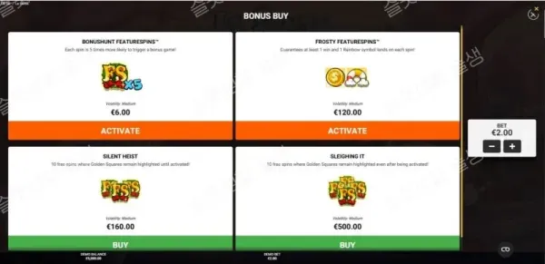 | Sleighing It Bonus | 250x | 스캐터 4개 등급의 상위 프리 스핀(10회) 라운드에 즉시 진입합니다. (※ 5개 등급은 직접 구매 불가) |