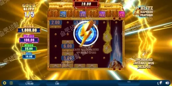 반대로 일반 심볼이 모두 사라지고 현금, 수집, 블리츠 익스프레스 기호만 등장하는 수집 특화 모드입니다. 수집 기호가 나올 때마다 누적 미터기(Accumulation Trail)가 채워지며, 일정 구간 도달 시 추가 스핀과 최대 5배(5x)의 현금 승수를 획득합니다. (※ 라운드 종료 시 보너스 리차지(Bonus Recharge™) 비용을 지불하여 연장 가능)