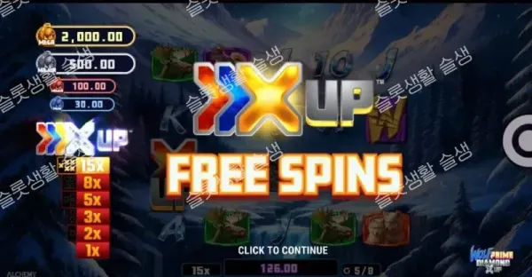 레드 스캐터 3개로 프리 스핀(8회)에 진입하면 베이스 게임에서 달성한 X UP 승수가 적용됩니다. 하지만 프리 스핀 시작 직전, '업사이저(Upsizer)' 기능을 통해 추가 비용을 지불하면 강제로 승수를 더 높은 단계로 업그레이드하여 시작할 수 있습니다.