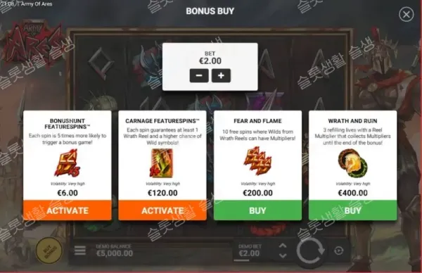 | Carnage Featurespins | 60x | 매 스핀마다 최소 1개 이상의 분노(Wrath) 릴 랜딩이 확정되는 특수 스핀입니다. |