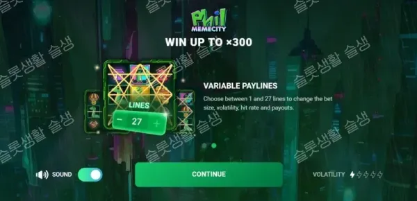 트루랩(TrueLab)이 2020년대 인터넷 밈(Meme) 문화와 암호화폐 열풍을 풍자한 독특한 테마의 필 밈시티를 출시했습니다. 복잡한 현대 비디오 슬롯의 트렌드를 역행하여 철저히 단순화된 3x3 그리드를 채택했으며, 프리 스핀이나 별도의 보너스 라운드를 완전히 배제했습니다. 대신 플레이어가 1개부터 27개까지 활성화할 페이라인을 직접 조절할 수 있는 '가변 페이라인(Variable Paylines)' 시스템을 도입했습니다. 최대 300배의 당첨금을 제공하는 매우 낮은 변동성(Low Volatility)의 캐주얼 슬롯입니다.