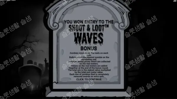 각 '웨이브(스핀)'마다 좀비 무리가 한 칸씩 아래로 전진합니다. 플레이어는 리볼버로 무장하며 웨이브마다 최대 3발의 총알을 무작위로 지급받습니다. 총알은 좌, 중, 우측 라인에서 가장 가까이 다가온 좀비를 쏘아 맞혀 각 좀비가 가진 고유의 혜택을 수집합니다. 단 한 마리의 좀비라도 최하단 방어선을 돌파하면 보너스 라운드는 즉시 종료됩니다.
