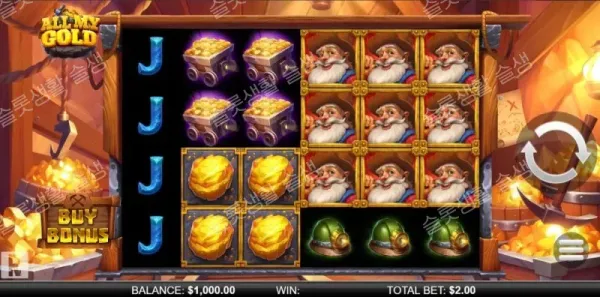 릴플레이(ReelPlay)가 정통 광산(Mining) 테마에 강력한 심볼 합성 메커니즘을 숨겨놓은 올 마이 골드를 출시했습니다. 6x4 그리드와 40개의 페이라인을 갖춘 이 슬롯은 겉보기엔 평범해 보이지만, 베이스 게임에서는 인접한 릴이 동기화되는 '잠금 릴(Locked Reels)' 기능을 지원합니다. 이 게임의 진가는 보너스 리스핀 라운드에 있으며, 2x2 이상으로 뭉친 금괴들이 '거대 금괴(BIG GOLD NUGGET)'로 합성될 때마다 합산된 승수를 2배로 뻥튀기하는 폭발적인 엔진을 통해 최대 10,000배의 당첨금을 달성할 수 있는 중간(Medium) 변동성 슬롯입니다.