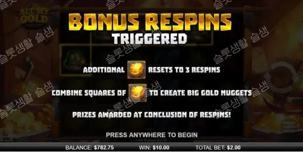 베이스 게임에서 6개 이상의 금괴(Gold Nugget) 기호가 랜딩되면 3회의 리스핀이 주어지는 홀드 앤 윈 방식의 보너스 라운드가 시작됩니다.