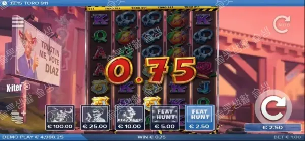 엘크 스튜디오(ELK Studios)의 간판스타인 투우 '토로(Toro)'가 스페인의 투우장을 떠나 범죄 도시의 경찰로 돌아왔습니다. 토로 911은 부패한 시장 '디아즈(Diaz)'와 그의 하수인인 투우사들을 소탕하는 액션 테마 슬롯입니다. 5x7 그리드와 421개의 페이라인을 기반으로 하며, 토로가 릴 위를 돌진하며 기호를 와일드로 변환시키고 승수를 흡수하는 역동적인 메커니즘을 자랑합니다. ELK 특유의 X-iter(엑스아이터) 보너스 구매 기능과 결합하여 '거리 정화(Clean the Streets)' 보너스 라운드에서 최대 10,000배의 당첨금을 쫓는 고변동성(High Volatility) 슬롯입니다.