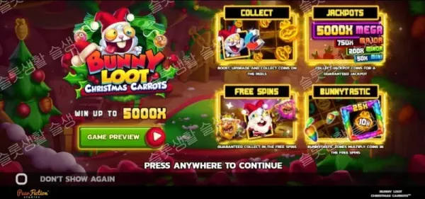 피어픽션 스튜디오(PearFiction Studios)가 기존 '버니 루트(Bunny Loot)' 슬롯을 연말 축제 분위기로 리메이크한 버니 루트 크리스마스 캐럿츠를 출시했습니다. 5x3 그리드와 20개의 페이라인을 바탕으로, 징글(Jingle)과 쟁글(Jangle) 두 엘프의 시너지 및 당근 수집 메커니즘을 핵심으로 합니다. 최대 200배(200x)까지 상승하는 버니태스틱 존(BunnyTastic Zone) 승수와 4가지 프로그레시브 잭팟 시스템을 통해 최대 5,000배의 당첨금을 제공하는 고변동성(High Volatility) 슬롯입니다.