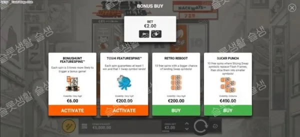 | Suckr Punch (2단계 보너스) | 200x | 200배의 비용으로 기호 분할(Slicing) 기능이 활성화된 서커 펀치 프리 스핀에 즉시 진입합니다. |
