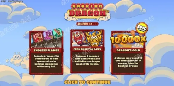 핵쏘 게이밍(Hacksaw Gaming)이 유쾌하고 느긋한 카툰 스타일의 동양 판타지를 테마로 한 스모킹 드래곤을 출시했습니다. 5x4 그리드와 1,024 웨이즈(Ways to win)를 제공하며, 당첨 시 하단 행 전체가 파괴되고 기호가 아래로 이동하는 독특한 '로우 캐스케이드(Row Cascade)' 연쇄 낙하 방식을 사용합니다. 낮음(Low) 변동성을 지녔음에도 불구하고 최대 100배의 에픽 승수 와일드와 3가지 단계의 프리 스핀 보너스를 탑재하여 최대 10,000배의 강력한 당첨금을 달성할 수 있는 캐주얼 슬롯입니다.