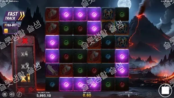 게임의 배경은 금방이라도 폭발할 듯한 화산지대입니다. 짙은 어둠 속에서 붉게 일렁이는 용암과 구름 낀 하늘 사이로 비치는 보름달이 오묘한 분위기를 연출합니다. 6x6 그리드 위에는 정교하게 조각된 보석들과 방패, 도끼, 칼, 투구 등 전사의 장비들이 심볼로 등장합니다. 슬롯밀 특유의 깔끔하고 세련된 그래픽은 고화질 환경에서 더욱 빛을 발합니다.