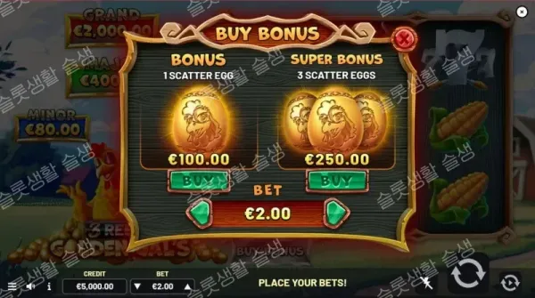 | Super Bonus (슈퍼 보너스) | 125x | 베팅액의 125배를 지불하고 스캐터 3개가 보장된 매우 강력한 상태에서 보너스 라운드를 시작합니다. 수집 효율이 비약적으로 상승합니다. (RTP 96.43%) |