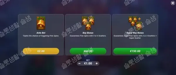 | Ante Bet (앤티 벳) | 추가 2x | 기본 베팅액에 2배의 비용을 추가로 지불하여 일반 및 슈퍼 프리 스핀의 진입 확률을 3배로 증가시킵니다. |